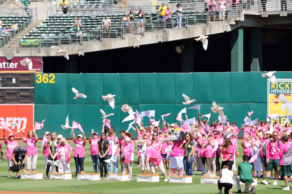 Finding our seats, we discovered we were in full sunshine. When we purchased the tickets, I didn’t believe that the mid September sun in Oakland would be an issue. Undaunted, we settled in for the game. The pregame ceremony were tied into Breast Cancer Awareness Day, and the ceremony was emotional, ending with the release of doves.