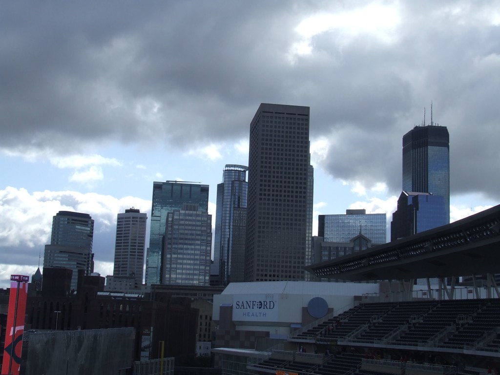 Breaks in the clouds after the fifth inning allowed a few rays of sun to sneak through, giving us a better view of downtown Minneapolis over the right field wall. Though there wasn’t enough sunshine to warm the air much, just seeing it through the overcast seemed to modify the fall chill firmly entrenched over the stadium.