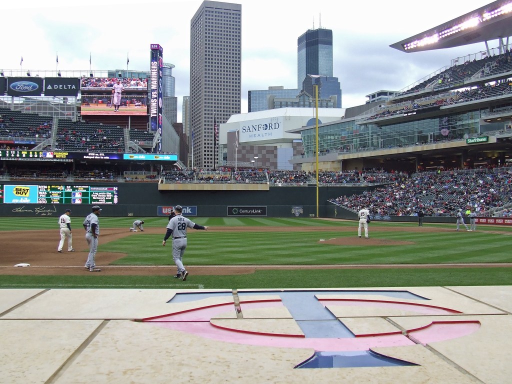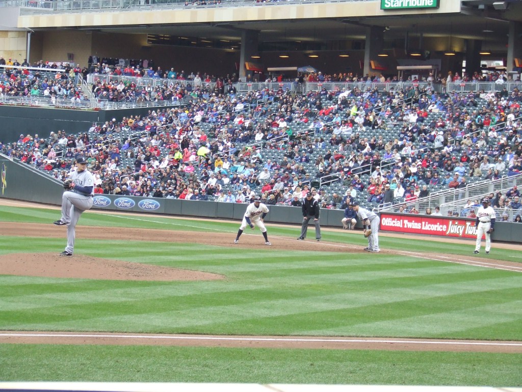 The sun made a brief appearance shortly after we arrived at Target Field, but since that time the sky maintained a slate gray overcast, ensuring little warming during the game. The Mariners scored single runs in the first and second innings to take an early lead. The Twins tied it up with runs in the third and fifth innings. Despite the starters having little MLB experience, they each performed admirably.