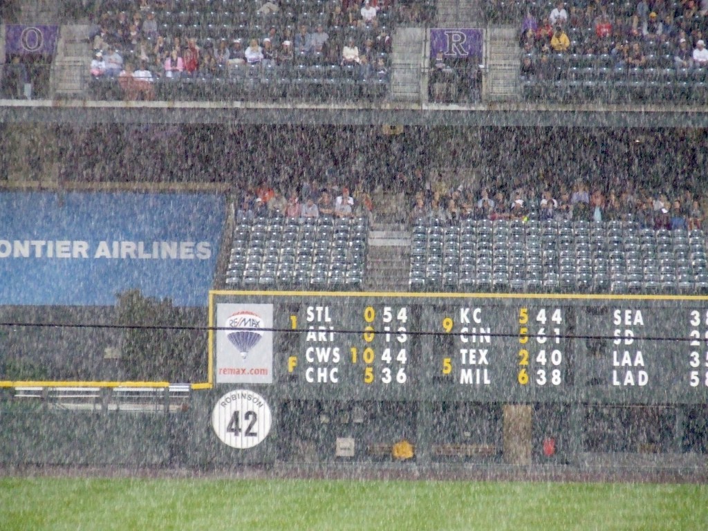 The Blue Jays opening the scoring in the second with a single run, and the Rockies responded with two runs in the bottom of that inning. The Blue Jays scored two more runs in the third to retake the lead, as Jimenez was experiencing his worst outing of the 2010 campaign. The intermittent rain was becoming steadier and heavier, chasing away most of the remaining fans. Having traveled 2,000 miles to see this game, we were determined to remain util the end.