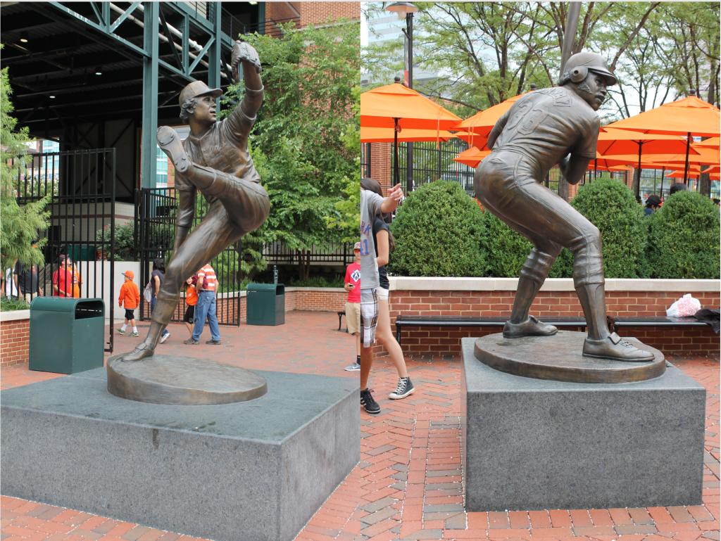 Camden Yards was designed as a replacement for Memorial Park, the home of the Orioles since their arrival in 1954. Designed to vaguely emulate the new Comiskey Park in Chicago, Camden Yards was the first MLB stadium since Ebbets Field (the home of the Brooklyn Dodgers until the late 1950s) to incorporate an existing building as park of the architecture of the stadium. B&O Warehouse, extending the length of Camden Yards’ right field wall, gave the ballpark an unmistakable landmark recognizable to even the most casual baseball fan. On the way back toward the home plate entrance, we discovered statutes outside of the park. Orioles greats Jim Palmer and Eddie Murray were immortalized in bronze, as were Brooks Robinson, Earl Weaver and Cal Ripken. Though new to us, this type of tribute would become nearly ubiquitous in the cadre of new MLB parks that would follow.