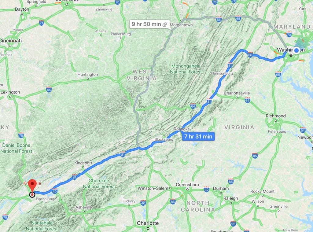 Google Maps showed a seven and one-half hour trip to Knoxville, TN.