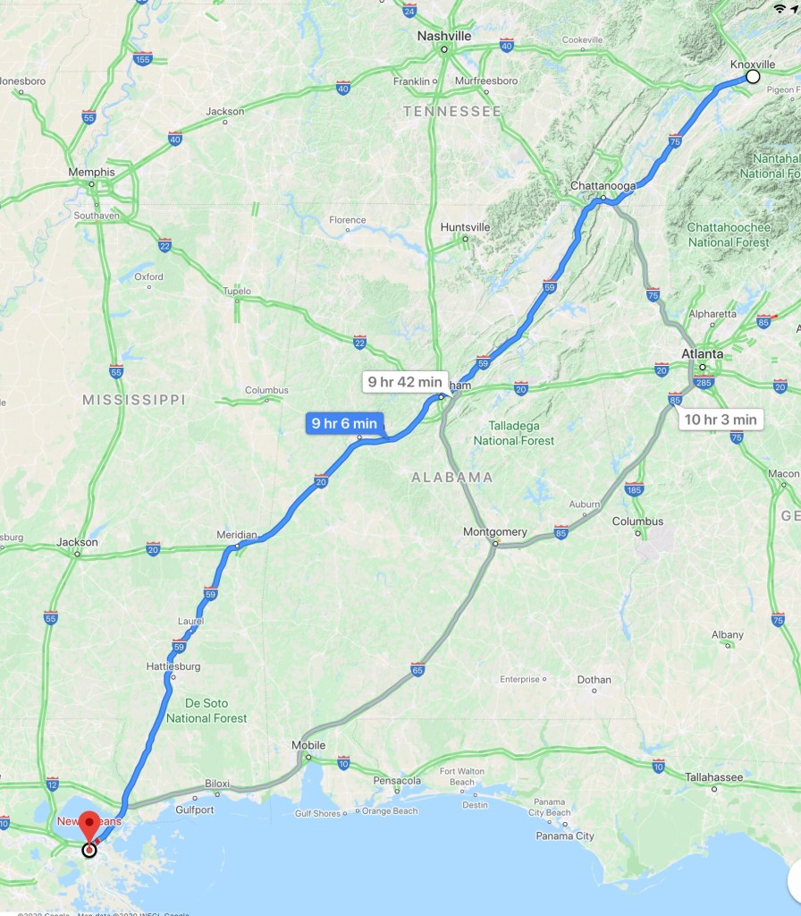 Google Maps showed a nine hour drive from Knoxville, TN TO New Orleans.