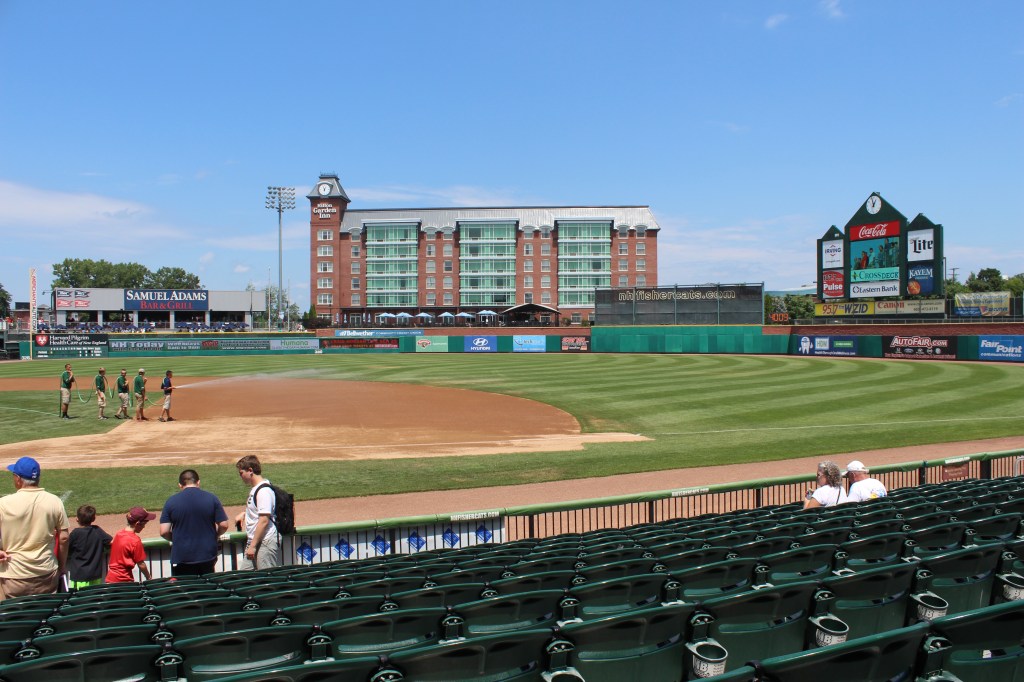The Hilton Garden Inn dominates the view at Northeast Delta Dental Stadium, as well as a relatively small but functional video board. (Photo credit: Jeff Hayes)