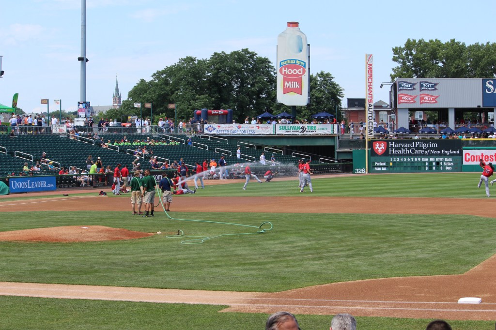 Bright sunshine splashed our seats, located just behind first base in the lower level. Factor in the rising humidity levels, and it was a typical July afternoon for baseball. As we have seen at many Sunday minor league games, the attendance was fairly light. The sparse crowd watched the Fisher Cats (the Double A affiliate of the Toronto Blue Jays) host the Portland Sea Dogs (the Double A affiliate of the Boston Red Sox), with the first pitch occurring shortly after 130 pm.