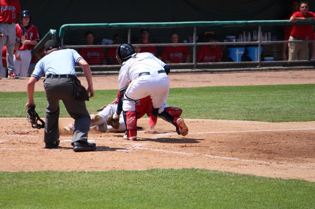 Portland Sea Dogs RF Henry Ramos was thrown out at the plate in the third inning. (Photo credit: Jeff Hayes)