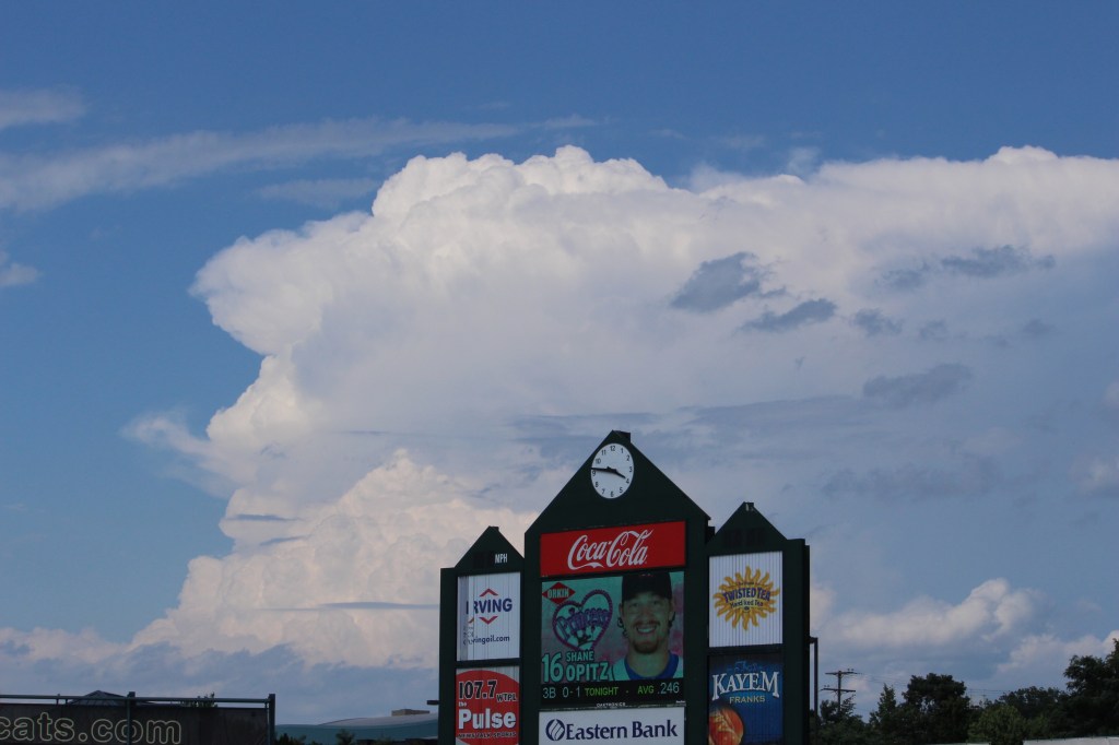 A lone thunderstorm lurking in the distance at Northeast Delta Dental Stadium. (Photo credit: Jeff Hayes)