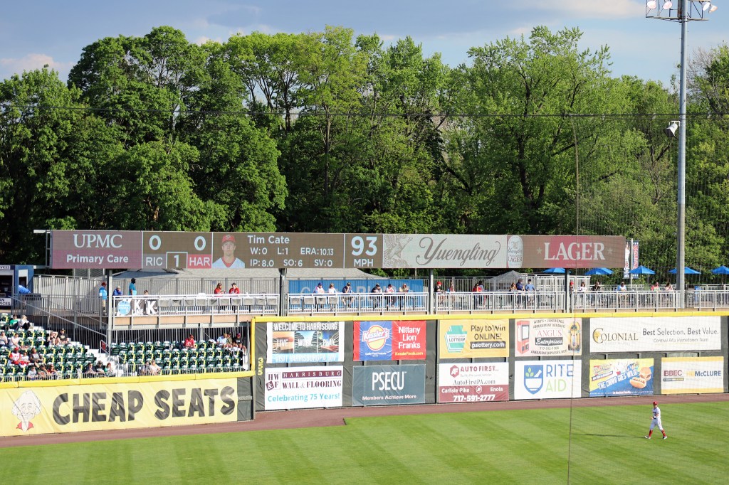 Walking along the concourse (which encircles the playing field), we wandered past the right field foul pole, where ongoing construction indicated additional seating in the right field corner, as well as a picnic area. While passing center field (and the batter’s eye), we found a grass covered seating berm stretched across left center field, in front of one of the two videoboards in the ballpark. We did not see anyone seated on the berm (it was probably too hot in the direct sunlight for that), but there were a few people milling around seats above the berm. Just beyond the berm was a left center entrance gate, for those fans entering from East Witherspoon Street.