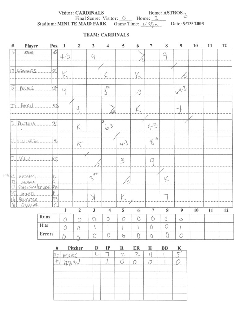 Starting for the visiting Cardinals was right hander Matt Morris. The six foot five inch right hander was an important part of the St Louis rotation, just two years removed from a 22 win season in 2001. On the mound for the hometown Astros was right hander Roy Oswalt. Pegged as the number four starter in the Houston rotation, Oswalt made 21 starts in 2003, posting a 10-5 record. Given the strong starting pitching and importance of the game in the playoff picture, we expected to see a pitcher’s duel at Minute Maid Park.