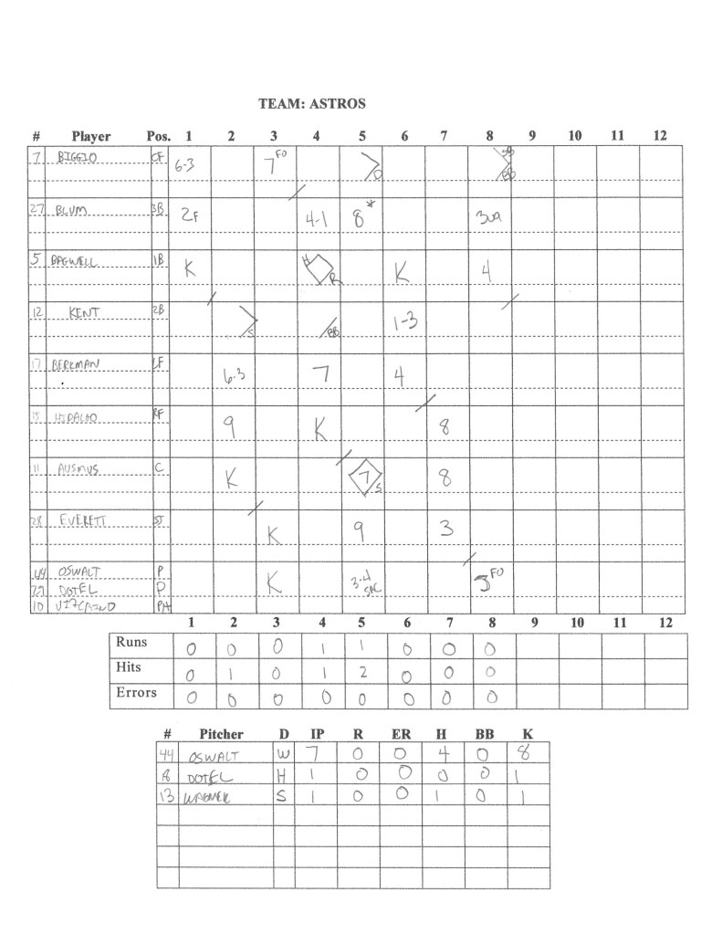 Following the ejections, the Astros scored single runs in the fourth and fifth innings, featuring 1B Jeff Bagwell’s 35th home run of the season. Meanwhile, Houston starter Roy Oswalt kept the Cardinals batters off balance, keeping St Louis scoreless into the late innings.