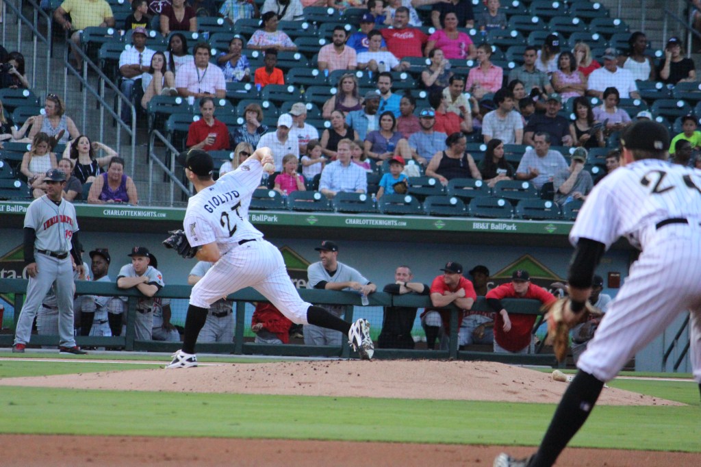 The Knights’ opponent for the game was the Indianapolis Indians, the Triple A affiliate of the Pittsburgh Pirates (a team we would see at home later in the 2017 season). Because of the 45 minute rain delay, the starters for the game were just warming up when we reached our seats. We were treated to a up close look at the Knights’ starter Lucas Giolito as he completed his warmup pitches in the bullpen before heading out to the mound.