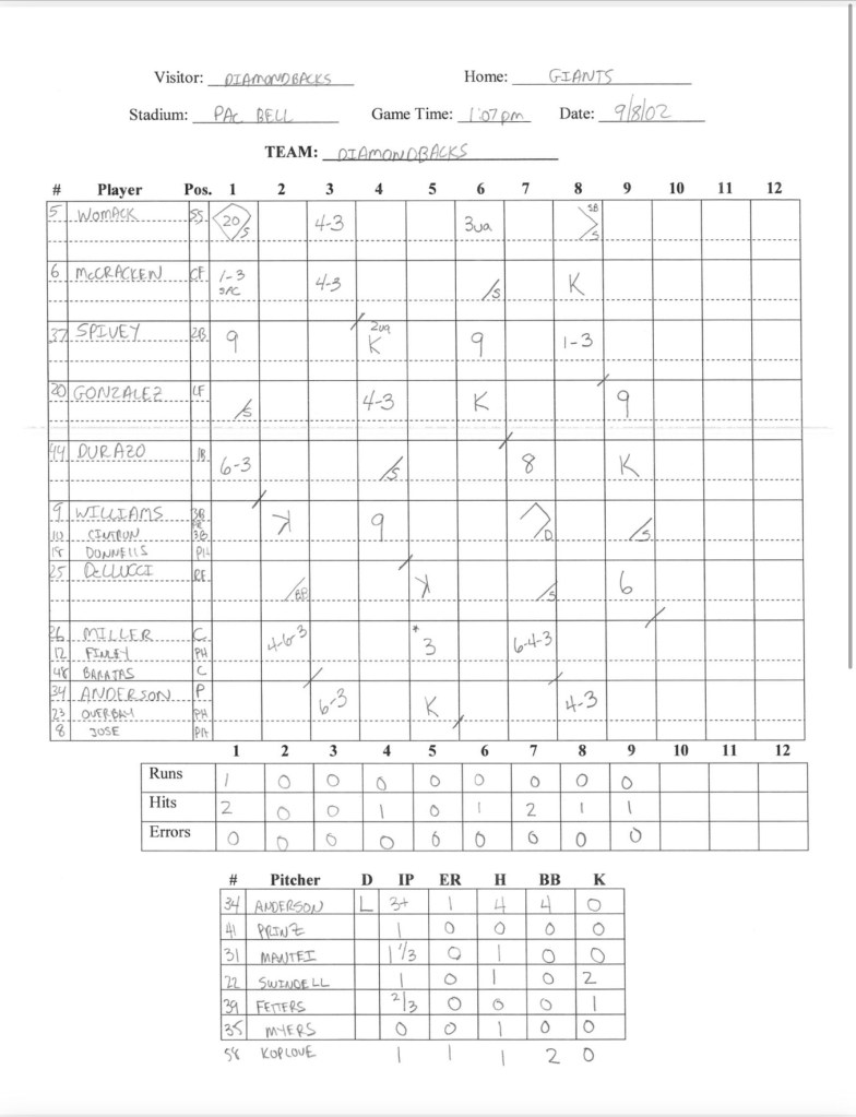 Starting for the visiting Diamondbacks was left hander Brian Anderson. Arizona’s fifth starter, Anderson was struggling through the 2002 campaign, which was sandwiched in between good 2001 and 2003 seasons. On the mound for the hometown Giants was right hander Russ Ortiz, the number two starter in a respectable but unspectacular San Francisco rotation. On the surface, this seemed to be a pitching mismatch after favoring the Giants, in what was an important game for both teams.