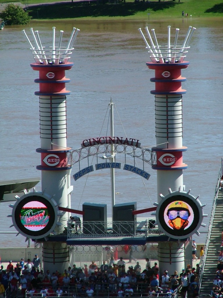In my opinion, one of the best features of Great American Ballpark is the Smokestacks. Located just to the right of the batter’s eye in centerfield, the Smokestacks were a nod to the history of the Ohio River, when paddle wheel boats were the main mode of transport for people and produce along the length of the river.