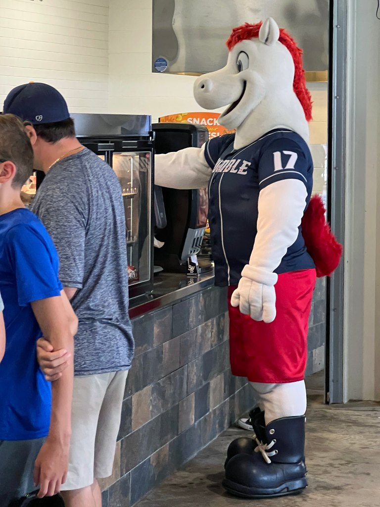 After we completed our tour of the ballpark, we headed to the concession stand to grab our baseball lunch. It was Champ’s birthday (the RailRiders’ mascot), and mascots from near and far attended to help him celebrate. While at the concession stand, my brother spotted Rowdy, the mascot of the Binghamton Rumble Ponies, purchasing what might have been an adult beverage for the games.