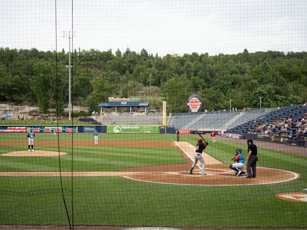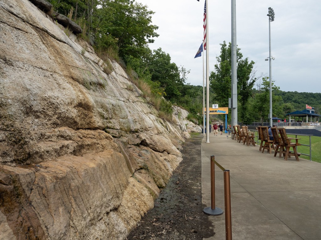 The Louisville Bats struck early, scoring two runs in the first inning off RailRiders’ starter Jhony Brito The RailRiders tied the game in the bottom of the frame on solo home runs by Oswald Peraza and Josh Breaux . However, the Louisville offense poured on the runs in the middle innings, essentially putting the game away by fifth inning. Meanwhile, Bats’ starter Justin Nicolino recovered from a rocky first inning to pitch seven innings. With the game outcome decided fairly early, we turned our attention to our surroundings. From our seats, we had a great view of the entire park, yet my attention was drawn to the rock face in right center field. The region is hilly, and the rock face was a good indication of the surrounding area.