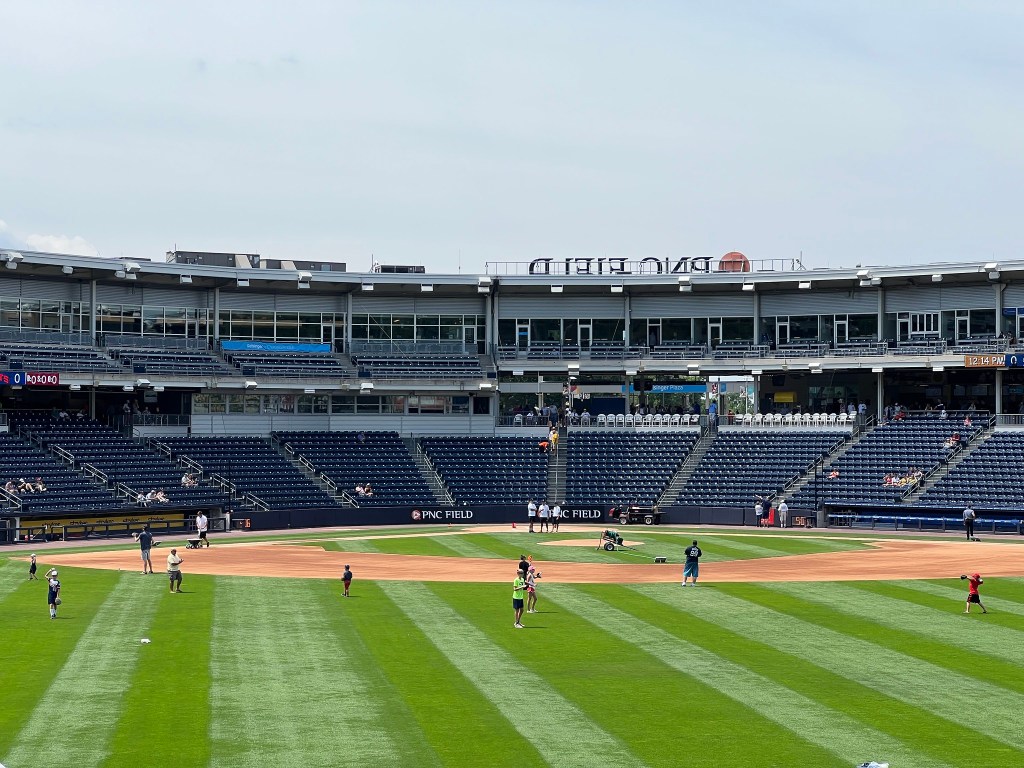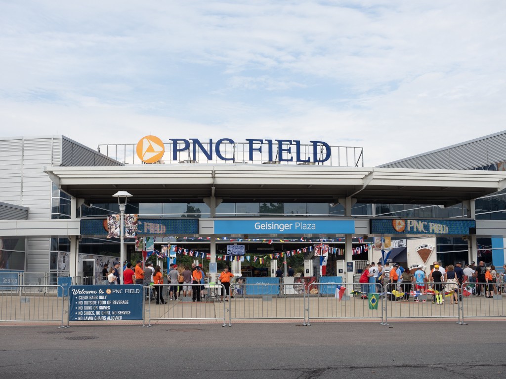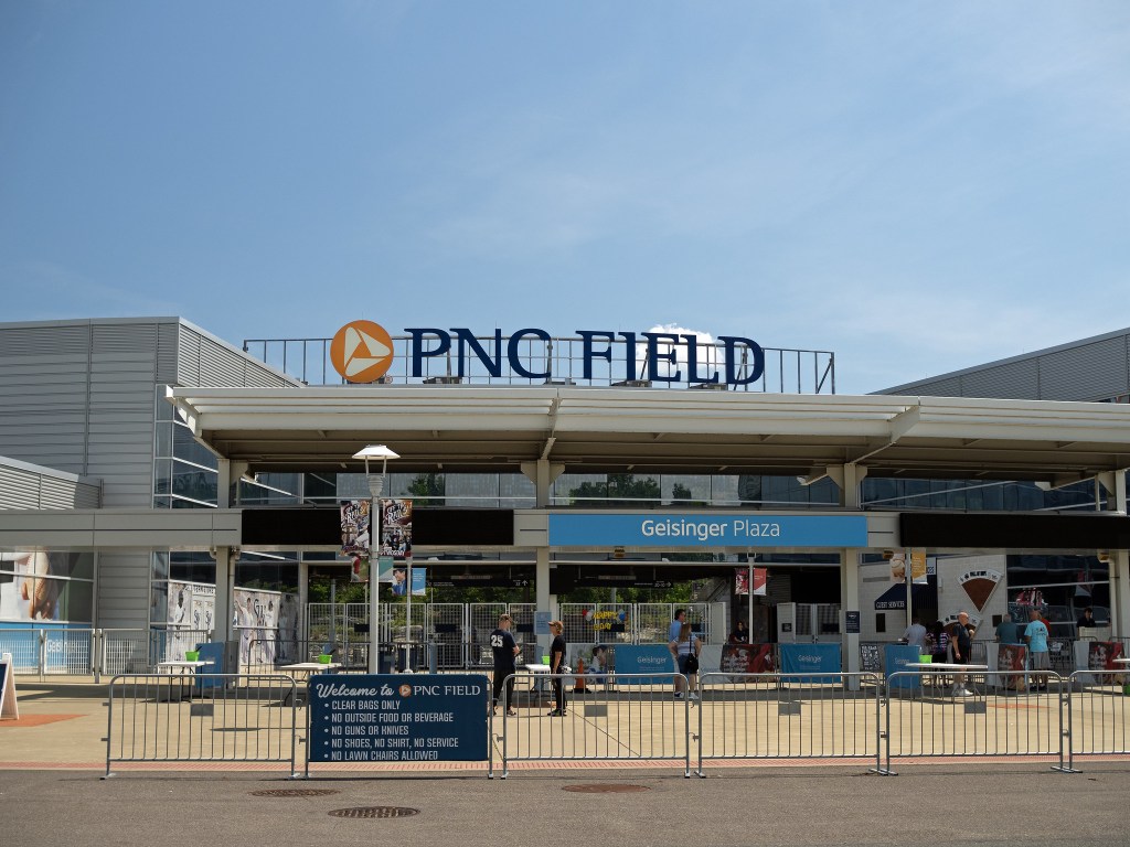 PNC Field is located off a local highway, and at first, it was difficult finding the main entrance, as it was obscured by trees. Once located, the entrance lead us to a VERY large parking lot in front of the park. Like most minor league ballparks, parking was $5, and there were multiple lanes of attendants collecting the fee. Note – PNC Field is a cashless facility, and credit cards are accepted for parking payment. Though we paid with cash this evening, we were encouraged to pay with a credit card the following afternoon. Arriving about 45 minutes before the gates opened (which was, like most minor league ballparks, one hour before the scheduled game time), we had intended to launch a drone and obtain some images and pictures of the ballpark. However, the ballpark is VERY close to the airport, severely limiting drone activities. Give proximity to the airport, and the potential to alarm fans, we scuttled the idea of a drone flight and toured the outside of the stadium. Without much to see outside, we waited until the gates opened at 500 pm.