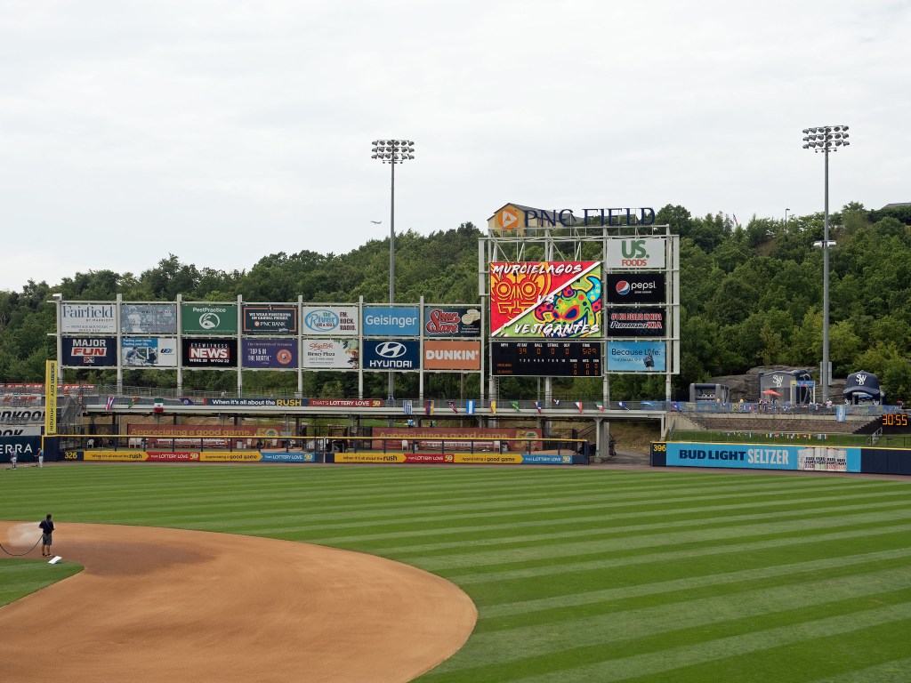 Other than the exposed rock face in right field, perhaps the most interesting attribute of PNC Field is the advertising billboards sitting atop the bullpens. Like most minor league fields, there is a two tiered advertising deck, but here the advertising billboards are above the playing field. It seemed like an elegant solution to what has been a problem of placement in other stadiums (with deleterious effects in some ballparks). The advertising is simultaneously visible yet unobtrusive sitting over the bullpens. Residing beyond the left field wall, it was refreshing to see the pens out of play, where they can be a hazard for players. Just to the right of the bullpens is the main scoreboard/videoboard. Surprisingly small for a Triple A venue, the video capability seems subpar, which was especially noticeable during replays of the action on the field.