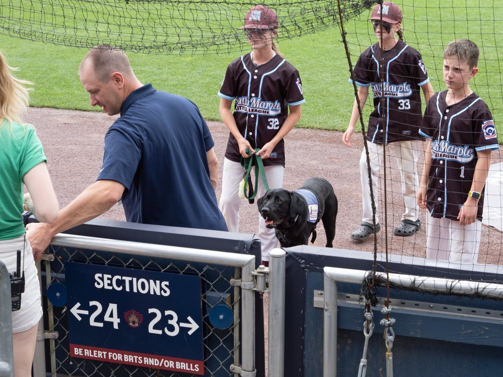 We sat in section 23 (infield box seats – get the tickets online; you will save some money versus obtaining the tickets from the box office), on the third base side. With clouds winning out, we did not have to contend with the sun much before the 605 pm start. During the pregame ceremonies, a star was born on the field. Wilson, a service dog in training, had finished his service with the RailRiders, and was being honored before the game. Though there were other activities occurring, Wilson stole the show.