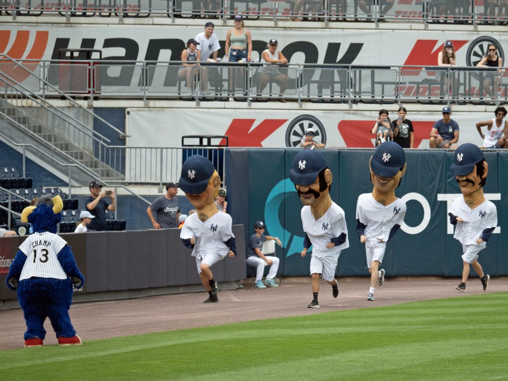 Lower clouds started to shroud the sunshine at PNC Field by the middle innings, which capped the temperatures. Had the sunshine dominated, conditions could have become brutal, but luckily that did not occur. That was good news for the participants of the Legends Race. Four Yankees Legends (Mickey Mantle, Joe DiMaggio, Thurman Munson and Don Mattingly) raced along the warning track dirt from left center field to the third base dugout. Many MLB and minor league teams have similar races, with similar themes, but my thoughts were with the people in the suits, having to run in the mid July heat.